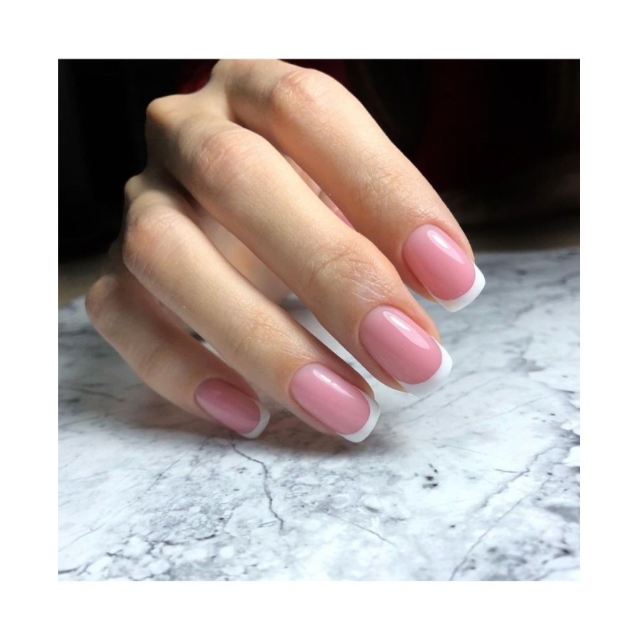 Aplique la base: la primera en una capa delgada, la segunda utilizada para nivelar la arquitectura. Bordea el borde libre. Seque cada capa durante 2 minutos con lámpara UV o 30 segundos con LED.