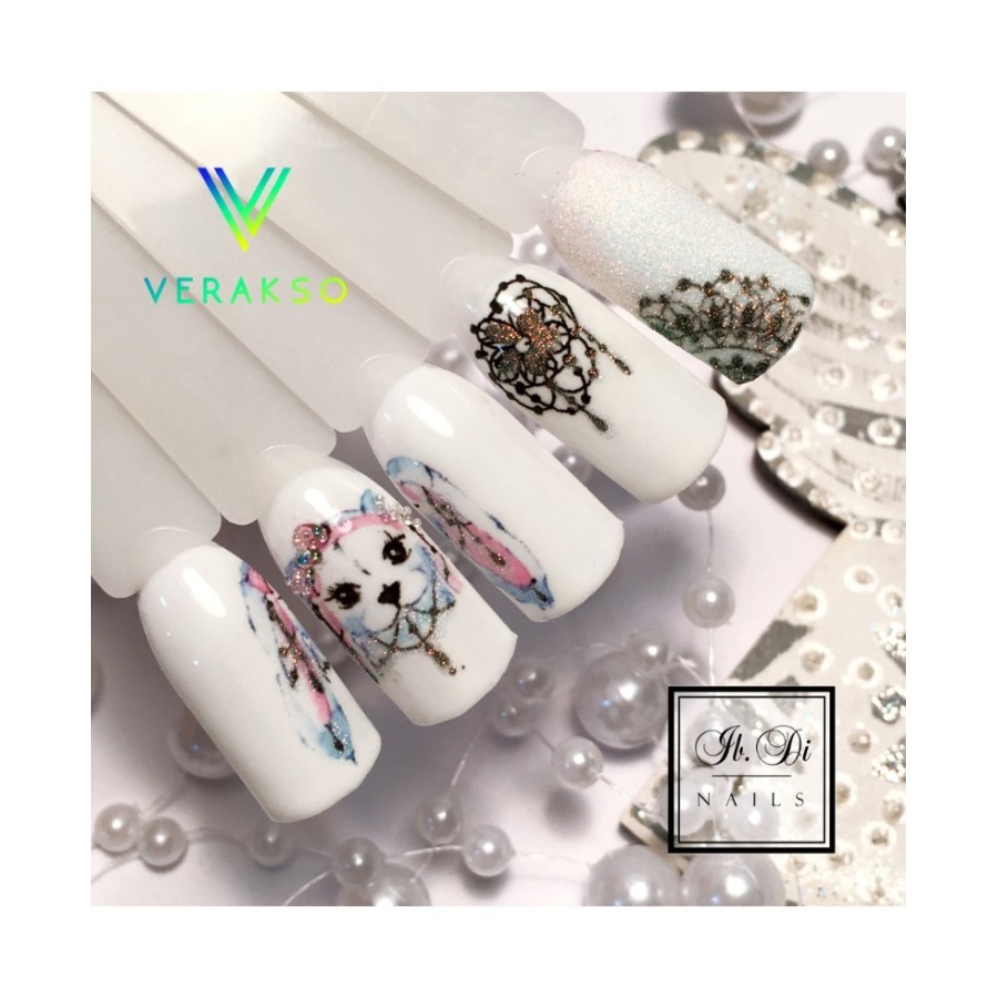 5. Coloque el diseño en una toallita de algodón humedecida en agua tibia (40-50 grados) (!)Dejando la parte de papel bajo la toallita (aproximadamente 15-30 segundos), transfiera la imagen deslizándola (SLIDER) hacia la uña. El polímero del material aumenta su elasticidad si se trabaja con agua más caliente.